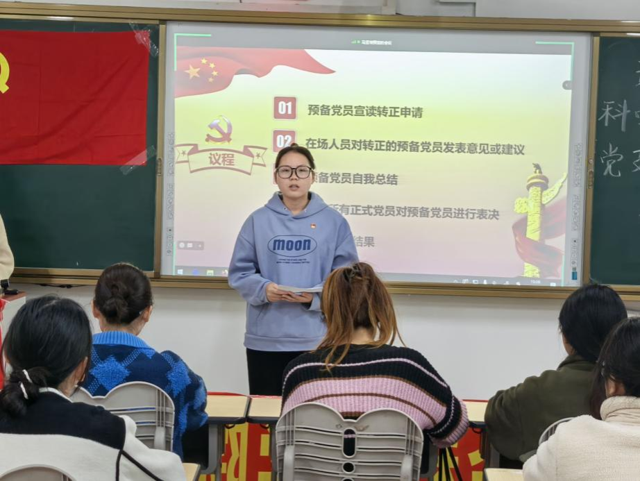 会议严格按照发展党员相关程序进行。会议伊始,党支部书记潘艳桃宣布了应到会、实到会的正式党员人数及会议的有效性。随后预备党员黄光娇宣读转正申请,汇报自己在预备期间的表现,总结思想上、学习上及工作和生活中的进步与不足,表明了加入中国共产党的志愿与决心。接着,入党介绍人对预备党员在预备期间的情况进行提问。最后,按“逐一讨论、逐一表决”的原则,对黄光娇能否转正问题进行了投票表决,一致同意黄光娇同志按期转为中国共产党正式党员。
