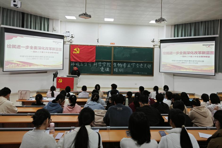 为深入学习贯彻党的二十届三中全会精神,深刻领会进一步全面深化改革的重要意义,11月27日,betway必威西汉姆联官网生物专业学生党支部在武鸣校区第二教学楼221教室开展了“绘就进一步全面深化改革新蓝图”主题党课。生物专业学生党支部全体党员参与学习,此次党课由党支部纪检委员黄珍海主持。