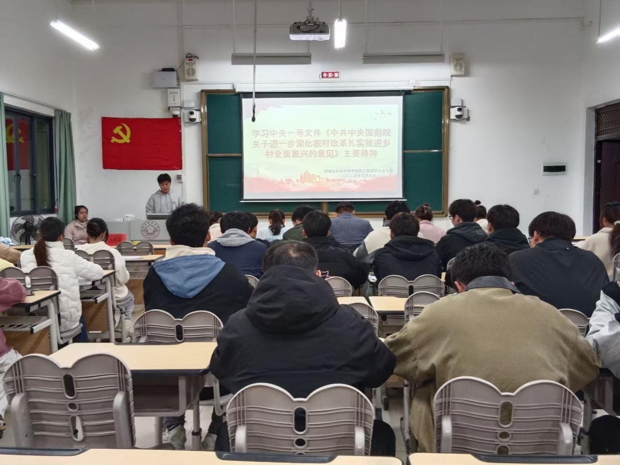 为深入学习领会习近平总书记关于“三农”工作的重要论述和重要指示精神,积极响应国家战略号召,助力乡村振兴,betway必威西汉姆联官网环工专业学生党支部于2025年3月9日晚在武鸣校区1号教学楼118教室召开专题会议,深入学习2025年中央一号文件《中共中央国务院关于进一步深化农村改革扎实推进乡村全面振兴的意见》。支部书记曲炳鹏及全体党员参会学习。
