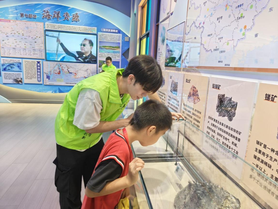 第三站是自然资源科普基地。作为中国南方重要生态屏障,广西的矿产资源种类繁多、储量丰富,水资源充沛,森林覆盖率高。在讲解员的引导下,小朋友们进一步认识了矿产资源、海洋资源,深刻感受到爱护水源、保护生态环境的重要意义。