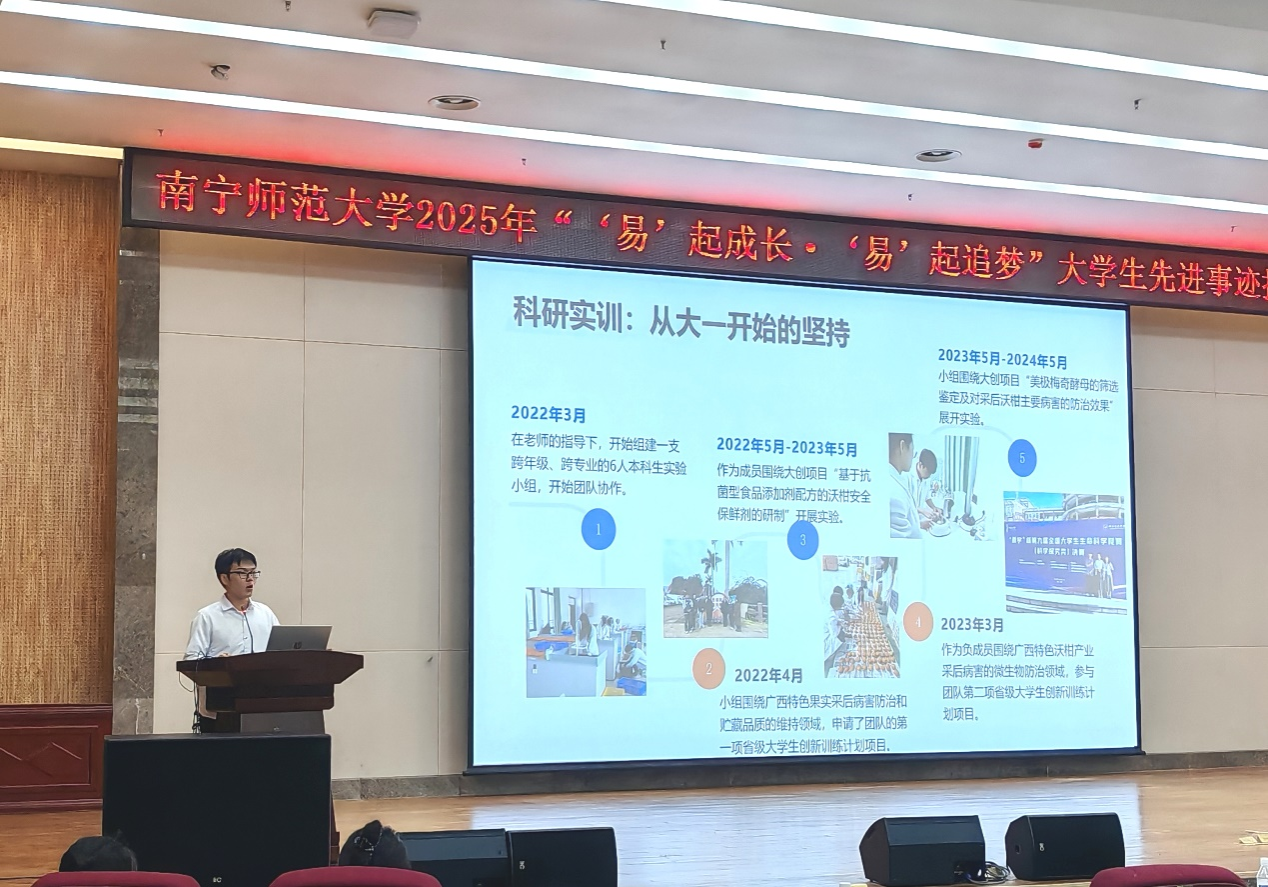 5月23日下午,betway必威西汉姆联官网2021级生物科学2班学生代表蒋琳华在武鸣校区图书馆报告厅参加“‘易’起成长,‘易’起追梦”大学生先进事迹报告会,并作主题分享。