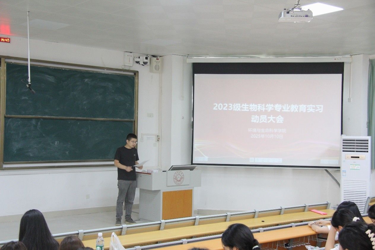 为了明确实习目标,动员学生做好生物科学专业教育实习准备,10月10日上午,我院在武鸣校区二号教学楼109教室召开2023级生物科学专业教育实习动员大会。出席本次大会的有学院院长何英姿、实习带队教师李鹏、赵志娟以及2023级生物科学专业全体学生。