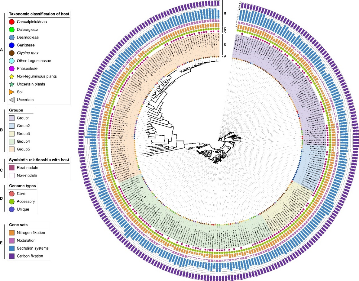 慢生根瘤菌属(Bradyrhizobium)是一类固氮菌,其中许多种类能与豆科植物共生固氮。近来对Bradyrhizobium的研究发现了其丰富的遗传资源和农业效益,但缺乏对其基因多样性和功能特性的全面调查。因此,我们对已被完整测序的278个菌株进行了泛基因组学分析,以预测Bradyrhizobium属的基因多样性和碳、氮固定相关基因特征。研究发现,Bradyrhizobium的泛基因组由84,078个基因家族组成,其中包含824个核心基因和42,409个附属基因,而固氮和结瘤等多种功能基因集中于附属基因组中。这些菌株的系统发育关系有宿主特异性聚类的趋势,在参与共生固氮的功能模块(如结瘤、固氮和分泌系统)的基因簇上存在差异,主要是nod、nif和ysc基因簇。来自土壤和非豆科植物的菌株缺乏共生固氮需要的nif/nod基因。这些发现阐明了Bradyrhizobium的固氮基因多样性和进化特征,为可持续的农业生产开发新的根瘤菌资源提供了重要理论依据。