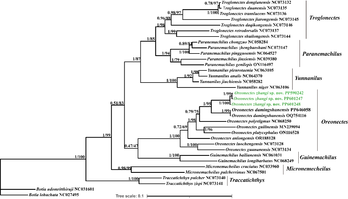 岭鳅属于1868年由英国动物学家Albert Günther发现并建立,模式种为平头岭鳅Oreonectesplatycephalus,在之后的很长一段时间中,平头岭鳅被认为广泛分布于中国的广西、广东以及越南等地。随着相关分类工作的进一步深入,有研究报道,真正的平头岭鳅应该只分布在珠江三角洲地区,而分布在广西境内的岭鳅属物种的分类地位需要进一步研究。本文作者于2023年国庆期间,在广西玉林市兴业县六西村寒山西线风景区水域(属南流江水系)采集了一批岭鳅属鱼类标本,基于和本属内其他物种的形态和线粒体基因细胞色素b基因序列的对比,该批标本为岭鳅属中的一新物种,为了纪念古时为当地人寻找水源的张氏兄弟,本新种命名为张氏岭鳅。