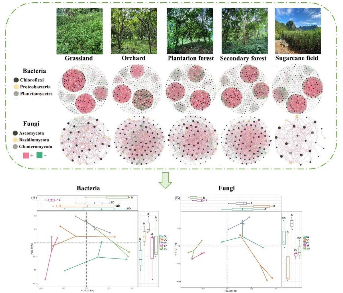 土地利用变化会影响物种多样性,然而,土地利用变化如何影响中国西南喀斯特洼地土壤微生物群落变化依然有待研究。因此,我们以广西弄岗国家级自然保护区为研究区,以甘蔗地、果园、草地、人工林和次生林为研究对象,分析不同土地利用类型下土壤微生物丰度、多样性、群落组成和共生网络的差异。结果表明,在不同土地利用类型间土壤真菌多样性差异显著,其中次生林真菌多样性最高,而细菌多样性差异不显著。共现网络显示变形菌门(Proteobacteria)、浮霉菌门(Planctomycetes)、绿弯菌门(Chloroflexi)、子囊菌门(Ascomycota)、和担子菌门(Basidiomycota)为关键类群,次生林、人工林和果园比草地和甘蔗地的土壤微生物群落结构更为复杂和稳定。该项研究为探索喀斯特土地利用变化对土壤微生物群落的影响提供了科学依据。