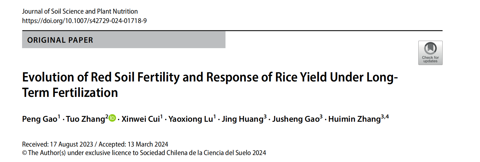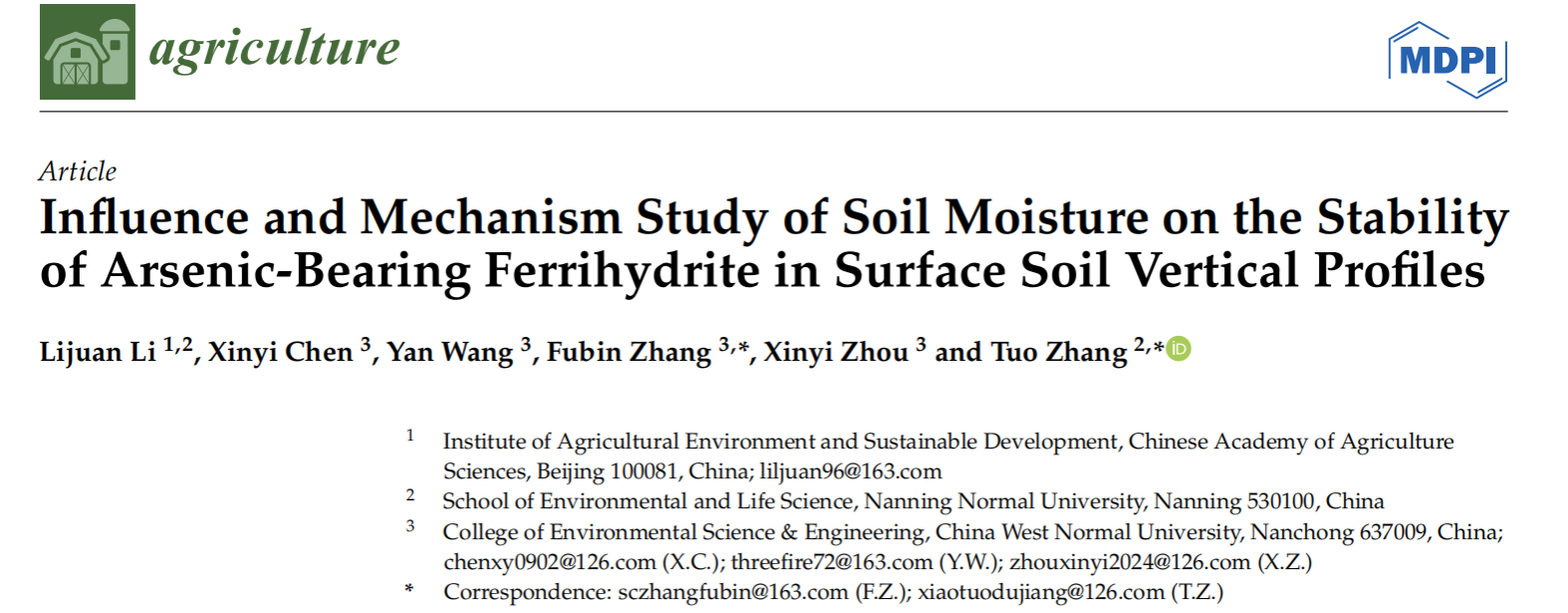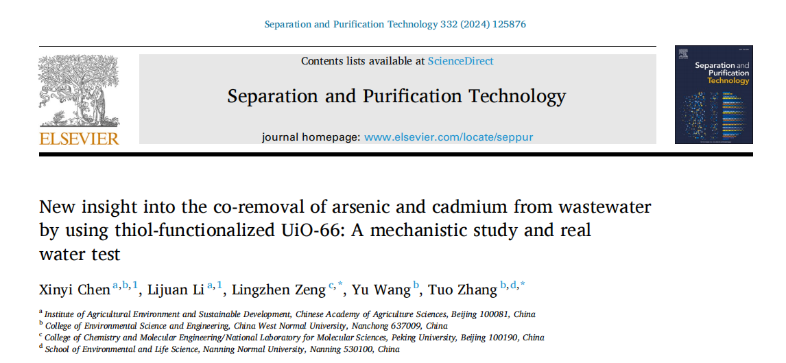 近日,我校betway必威西汉姆联官网张拓副教授分别与北京大学、新疆农业大学、中国农业科学院和湖南省农业科学院合作在工程技术/化工领域著名期刊《Separation and Purification Technology》(中科院1区TOP,JCR1区,IF2023=8.1),综合类领域期刊《Scientific Report》(中科院2区,JCR1区,IF2023=3.8)、农业综合领域期刊《AgricultureBasel》(中科院2区,JCR 1区,IF2023=3.3)、土壤学领域期刊《Journal of Soil Science and Plant Nutrition》(中科院3区,JCR1区,IF2023=3.4)发表了题为《New insight into the co-removal of arsenic andcadmium from wastewater by using thiol-functionalized UiO-66: A mechanistic study and real water test》、《Influence and Mechanism Study of Soil Moisture on the Stability of Arsenic-Bearing Ferrihydrite in Surface Soil Vertical Profiles》、《Effective co-immobilization of arsenic and cadmium in contaminated soil by sepiolite-modified nano-zero-valent iron and its impact on the soil bacterial community》、《Evolution of red soil fertility and response of rice yield under long-term fertilization》的4篇高水平研究论文。上述文章深度探究了新型环境功能材料UiO-66-SH、海泡石负载纳米零价铁S-nZVI和纳米水铁矿在水体和土壤环境中对砷和镉两种重金属的同步钝化过程机制和重金属污染在土壤长期耕作条件下潜在的迁移释放过程机制。张拓副教授为上述4篇论文的通讯作者,南宁师范大学为第一或主通讯单位。上述多项研究工作得到了国家自然科学基金、国家重点研发计划课题、四川省自然科学基金和中央级科研院所基本科研业务费的支持。
