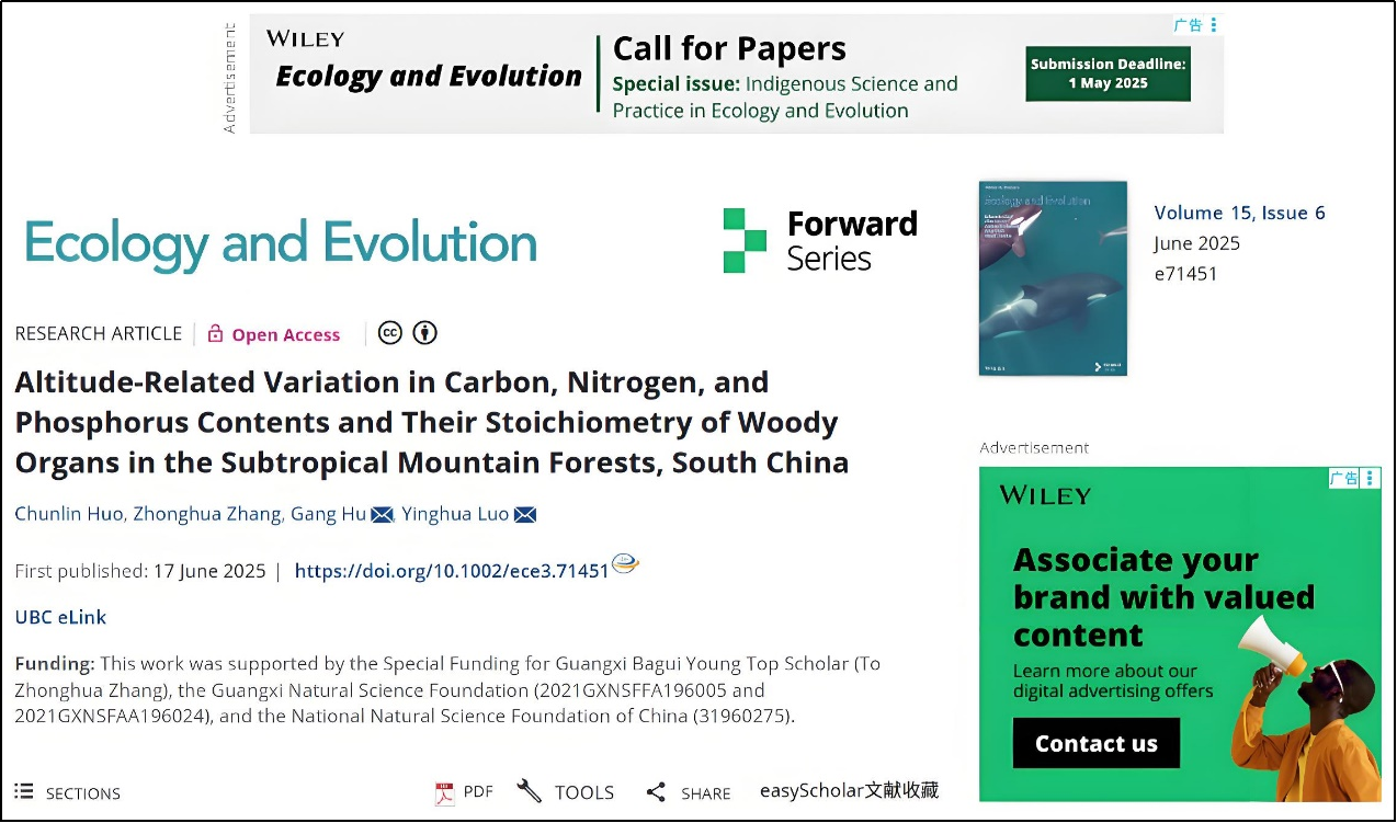 近期,我校生态和环境修复高水平人才团队在山地森林生态化学计量学研究领域取得新进展。相关成果以“Altitude-relatedVariation inCarbon,Nitrogen, andPhosphorusContents andTheirStoichiometry ofWoodyOrgans in theSubtropicalMountainForests,South China”为题发表在国际学术期刊Ecology and Evolution(中科院2区)。我院胡刚教授(广西大学林学院兼职硕导)和广西大学罗应华老师为论文共同通讯作者,广西大学硕士研究生霍春霖为第一作者,我院张忠华教授参与了研究。研究得到广西八桂青年拔尖人才项目、广西自然科学基金项目等的资助。该研究也是BEST(Biodiversity along Elevational gradients: Shifts and Transitions)研究网络(http://BEST-mountains.org)的成果之一。
