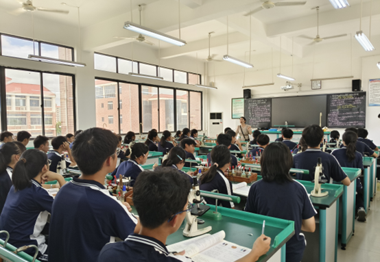 9月12日第八节课,高一生物组王晓光老师带领黄国新、何媛煜两位实习老师,在高一A(11)班开展生物实验教学,内容涵盖“检测生物组织中的糖类、脂肪和蛋白质”与“黑藻叶绿体观察”。实习老师在王老师的指导下,提前梳理实验重难点,并在课堂上清晰演示操作步骤、强调安全注意事项。学生们则在实习老师的协助下,亲自动手操作显微镜、调配检测试剂,沉浸式体验生物实验的探究过程。不仅顺利完成了高中生涯第一次生物实验,也熟练掌握了使用显微镜的实践技巧以及如何检测观察组织中的还原糖、脂肪和蛋白质的科学知识,打造了一场生动有趣的实验课。