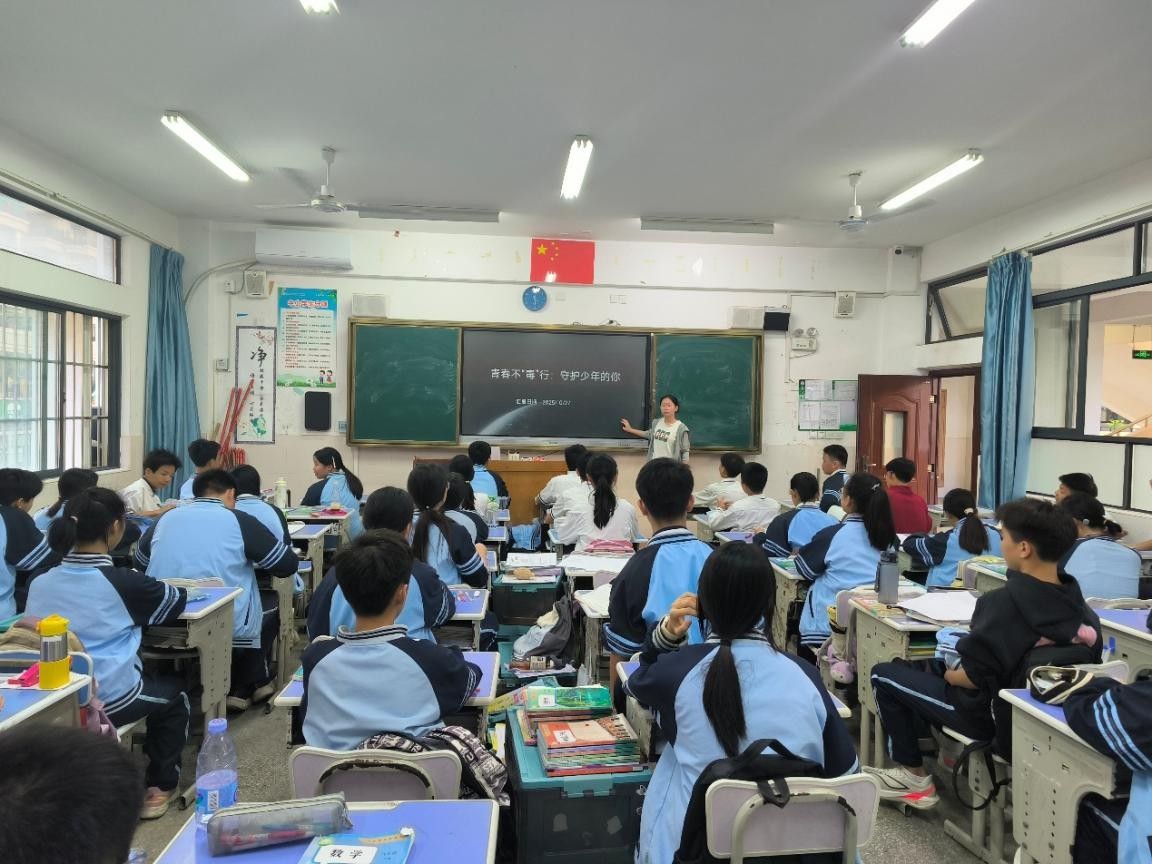 10月27日,实习生们组织同学开展拒绝毒品主题班会——“青春不‘毒’行,守护少年的你”,活动采用多媒体视频和情景模拟的形式,向同学们揭示了毒品对个人身心健康、家庭幸福和社会稳定的巨大危害。在情景模拟中,同学们踊跃发言,分享如何拒绝毒品的方法。学生在互动和思考中,深刻认识到毒品的巨大危害,坚定了“远离毒品,从我做起”的信念。