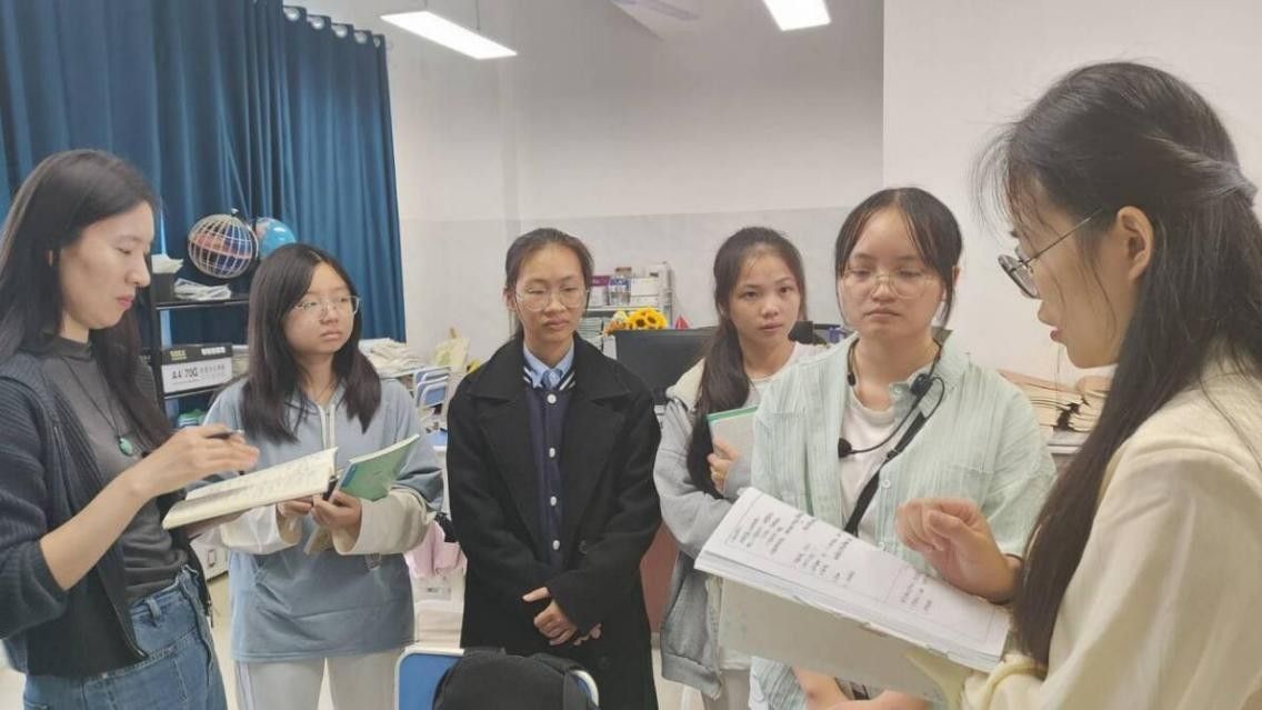 本周,多位实习生走上讲台,独立承担了生物课程的教学任务。赵志娟老师与兴宁二中带教老师廖小瑶一同深入课堂听课,并在课后组织了细致的评课活动。廖老师对实习生们的进步给予高度肯定。她表示,与第一节课相比,同学们的教态更自然、语言更精炼、课堂组织更有序,已经初步具备了一名准教师的专业素养。随后,两位老师结合具体教学片段,从板书设计、提问技巧、时间分配、学生反馈等方面提出针对性建议,帮助实习生精准定位改进方向。实习生们表示,这样“一对一”的指导让他们受益匪浅,也增强了未来走上讲台的信心。