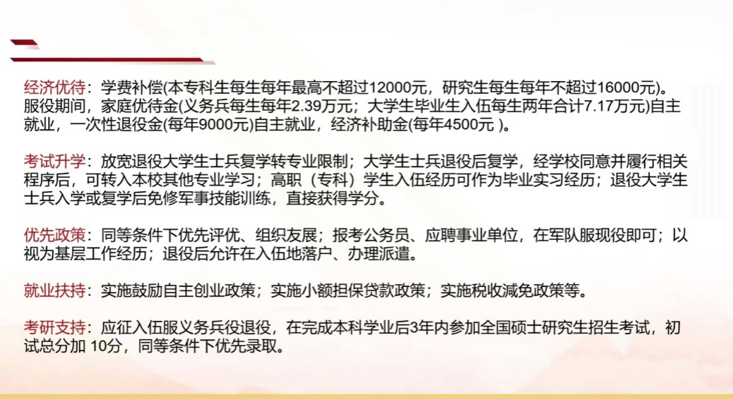 会议伊始,权益部工作人员张诗诺向同学们介绍了党的二十大报告关于实现建军一百年奋斗目标,开创国防和军队现代化新局面的思想以及我国必须要建设一支强大的人民军队的原因,这些思想和目标帮助同学们了解了我国的国防需求,让同学们更深刻地认识到参军入伍是每个公民的权利和义务。随后,张诗诺又详细地向同学们介绍了参军入伍的条件、国家给予应征入伍学生的优惠政策以及应征入伍的奖励。其中,应征入伍的优惠政策是讲解的主要部分,这些政策都为学生入伍提供了极大的便利。最后,张诗诺向同学们讲解了入伍的流程并给大家分享了学院入伍同学的经历。