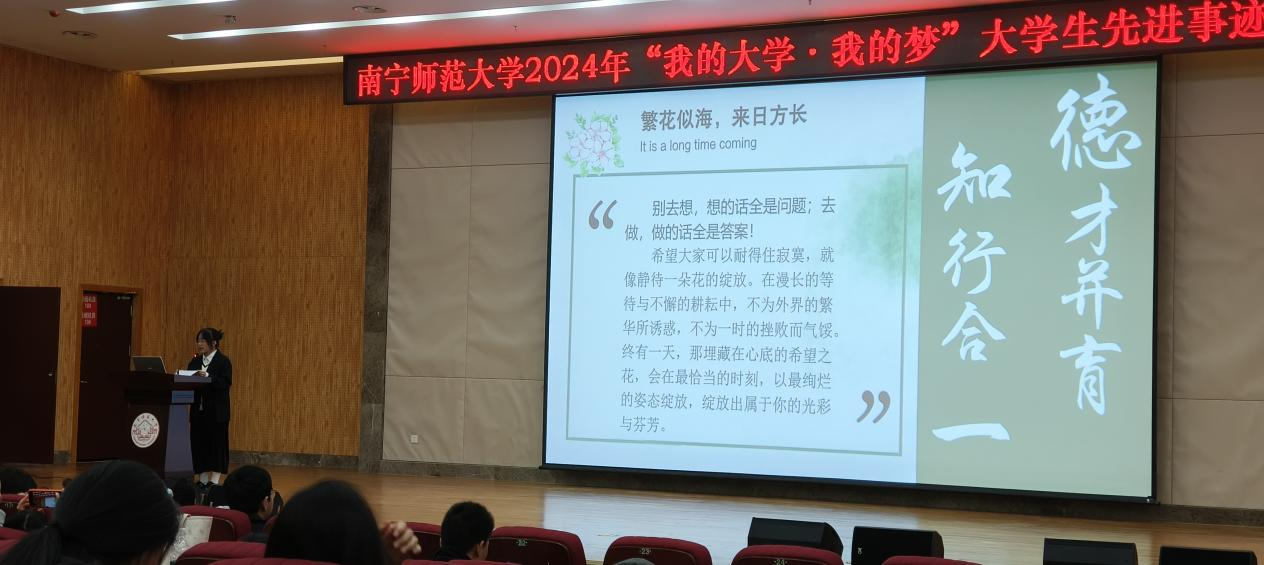 12月17日下午,我院学生代表欧晓蕾在我校武鸣校区图书馆报告厅参加“我的大学·我的梦”大学生先进事迹报告会,并作主题分享。