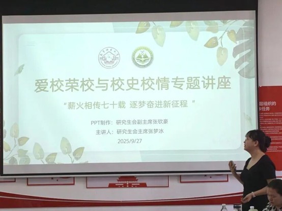 活动最后,张梦冰同学对本次入学教育的四大核心内容 —— 爱国情怀培育、爱校荣校与校史校情教育、管理制度与校纪校规教育、安全稳定与心理健康教育进行了总结。莫莉萍老师鼓励全体新生以饱满的热情、昂扬的斗志开启研究生生涯,在学习科研中积极进取,为学校与学院的发展贡献青春力量。此次入学教育全面覆盖思想引导、学业规划、生活适应、安全防护等关键领域,成功为新生搭建起适应新身份、融入新环境的桥梁,为他们开启研究生阶段的成长之旅奠定了坚实基础!