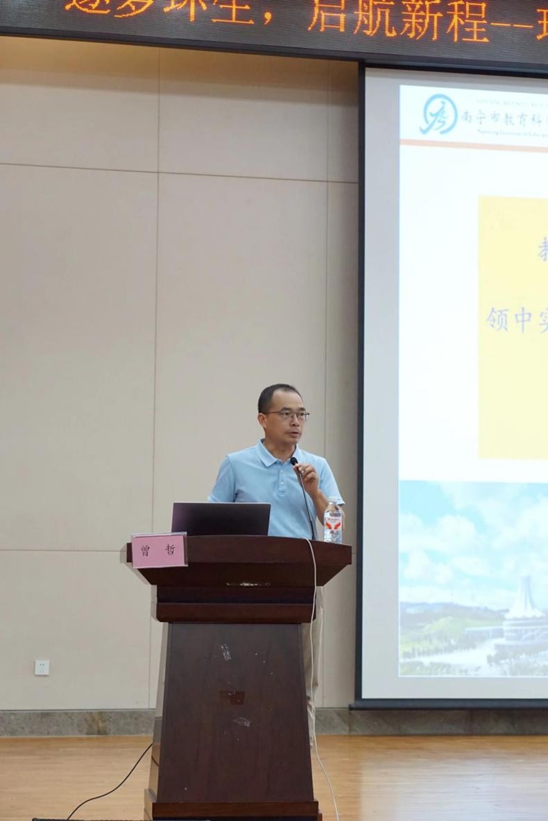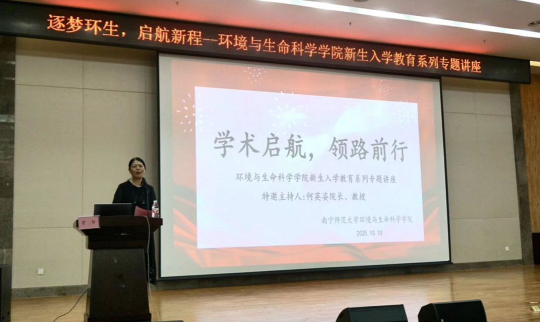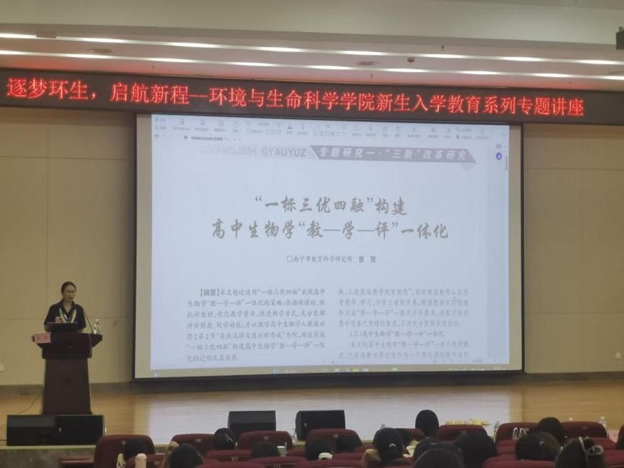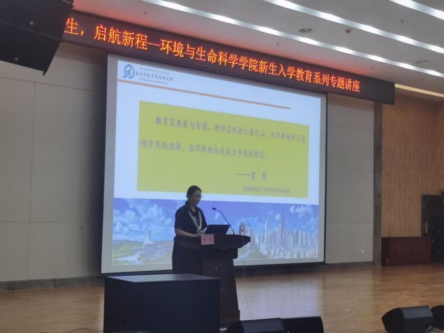 10月10日,betway必威西汉姆联官网在武鸣校区图书馆一楼报告厅举办2025年“学术启航,领路前行”新生入学教育专题讲座。本次特邀南宁市教育科学研究所生物学科教研员,广西特级教师,正高级教师,南宁师范大学校外硕士研究生导师的曾哲老师开展讲座,曾哲老师长期致力于教育评价改革研究和初中高中新课程改革的实践研究,提出“一标三优四融”教学评一体化教学模式、拔尖创新人才初高中一体化培养途径等教学成果,推动区域教育质量的提升。此次应邀到来,主要以自己从教多年的经验为师生分享成长故事与职业感悟。本次活动由何英姿院长主持,党委书记韦东林、研究生班主任莫莉萍、硕士生导师张鹏飞等教师代表出席本次会议,参会人员还有学科教学(生物)研究生、生物科学专业全体本科生。