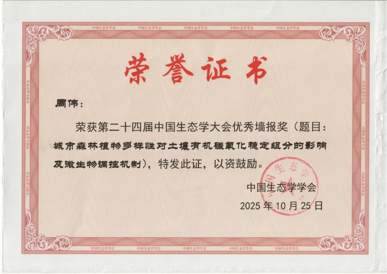 两位同学分别依托立项的国家级、自治区级大学生创新创业训练计划项目,在周伟老师的悉心指导下,围绕城市森林土壤固碳功能及其微生物驱动机制这一前沿主题,完成了从实验设计到数据分析的科研训练,取得初步创新成果。此次获奖既是对学生个人科研潜力与专业素养的肯定,也彰显了betway必威西汉姆联官网本科生创新创业培养成效。