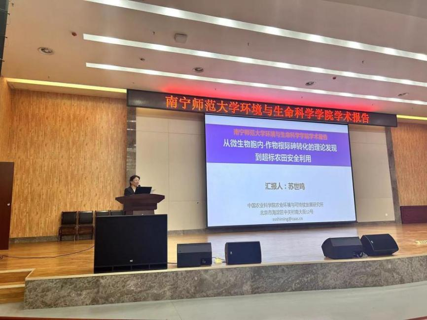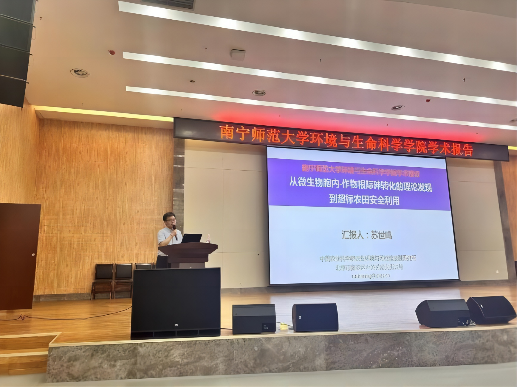 5月11日,在学院成立十周年之际,应学院邀请,中国农业科学院农业环境与可持续发展研究所科技部创新团队首席科学家苏世鸣研究员于武鸣校区图书馆报告厅为学院师生作了题为《从微生物胞内-作物根际砷转化的理论发现到超标农田安全利用》的学术报告。报告会由宋书巧院长主持。