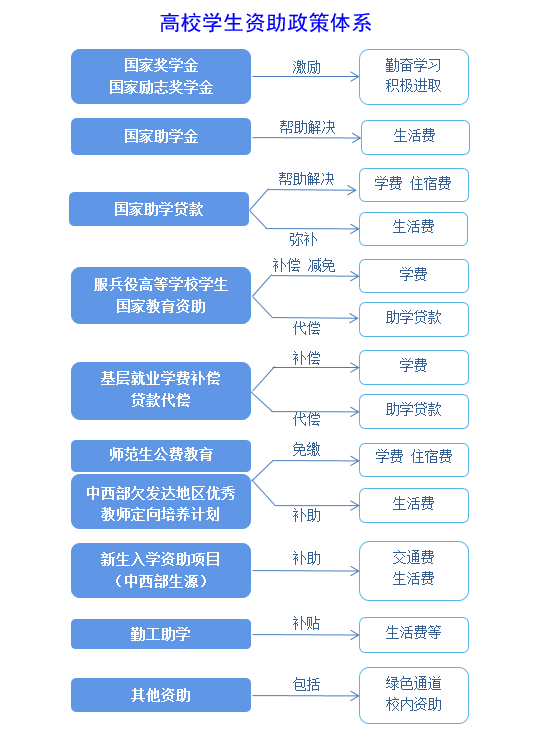 国家在高等教育本专科阶段建立起国家奖学金、国家励志奖学金、国家助学金、国家助学贷款等多种形式有机结合的高校学生资助政策体系。