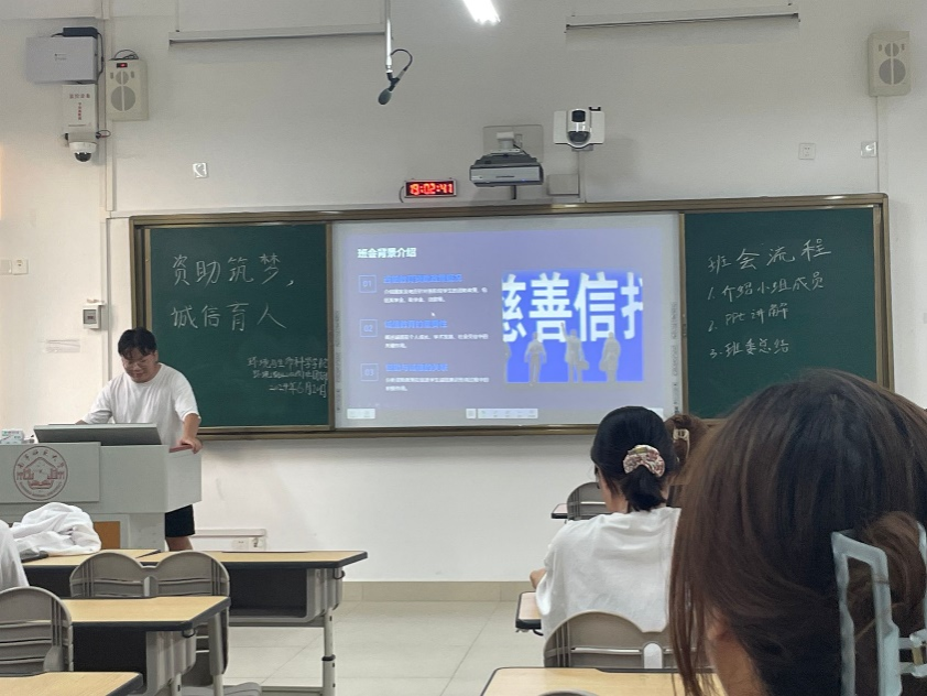 各班根据校园生活和学习阶段的实际情况,开展本次主题班会。在大一年级的班会上,班级代表向同学们说明了资助政策的背景与意义,重点讲了奖学金设立与评选流程,使同学们对资助政策有了初步了解。在大二、大三的班会上,班级代表着重提到了各类奖助学金的评选要求和获奖助学金对个人未来发展的意义,鼓励同学们认真学习努力争取获得奖助学金,同时,业余可通过勤工俭学的方式缓解学杂费的压力。在大四的班会上,班级代表主要从诚信、感恩以及个人未来和国家发展相结合三个方面开展主题班会。