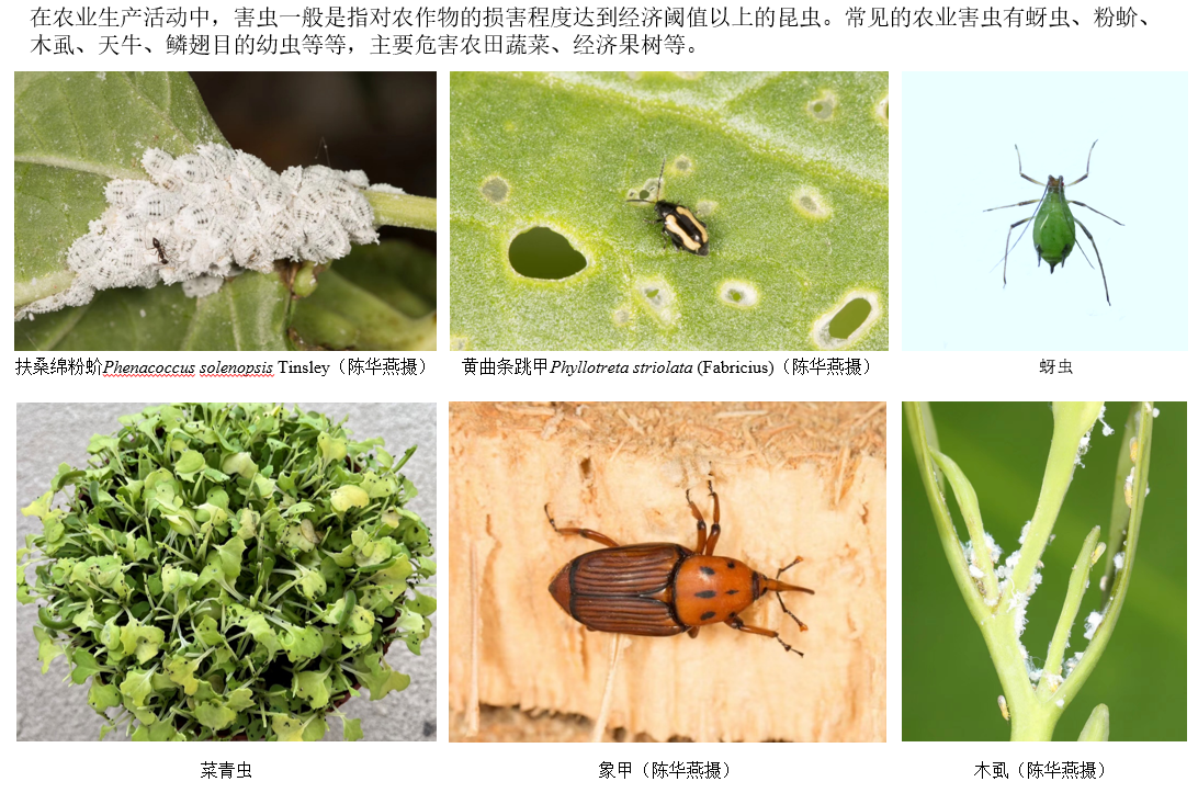常见害虫:在农业生产活动中,害虫一般是指对农作物的损害程度达到经济阈值以上的昆虫。常见的农业害虫有蚜虫、粉蚧、木虱、天牛、鳞翅目的幼虫等等,主要危害农田蔬菜、经济果树等。
