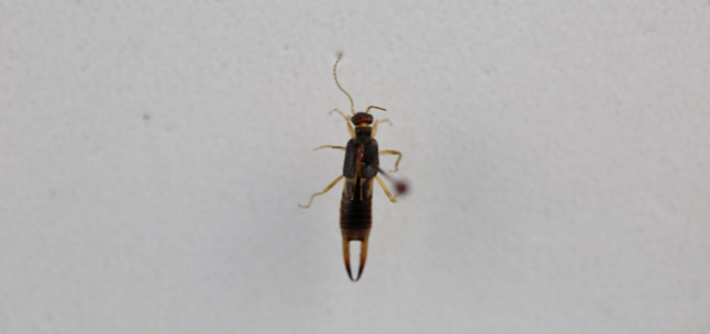 革翅目蠼螋科。体长而扁,黄褐色,鞘翅栗色,足浅黄色。头、前胸及腹部背面颜色较深。腹部末端浅色,尾夹浅黄色,粗大,直伸,具一内齿。体长12~24mm。
