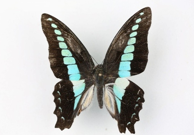 翅膀背面是淡雅的黄白色,一旦合拢却会展现出迷人的黄绿色彩,如同换上了一套“隐身衣”。它们翅膀末端那对细长的尾突,好似佩带着两把精致的“宝剑”,因此拥有了“仗剑走天涯”的潇洒美名。更有趣的是,这对“宝剑”对于绿凤蝶至关重要,一旦受损可能会影响其飞行甚至生存。分布于广东、广西、香港、越南、印度、泰国、锡金、马来西亚等。