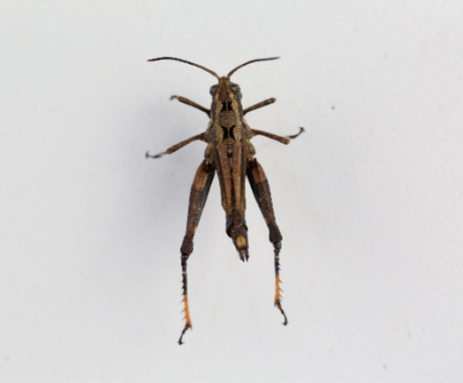 直翅目斑腿蝗科。体褐色或浅褐,头顶具浅黄带,前胸背板上有深色斑点,后足腿节有黄色斑块,胫节顶端是橘红色或橘黄色的。雄性体型较大,肛上板盾形,尾须扁。雌性体较雄性为大,触角较短,肛上板钝角三角形,产卵瓣粗壮。
